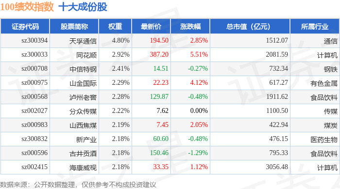 100绩效(399656)指数十大成份股详情如下: