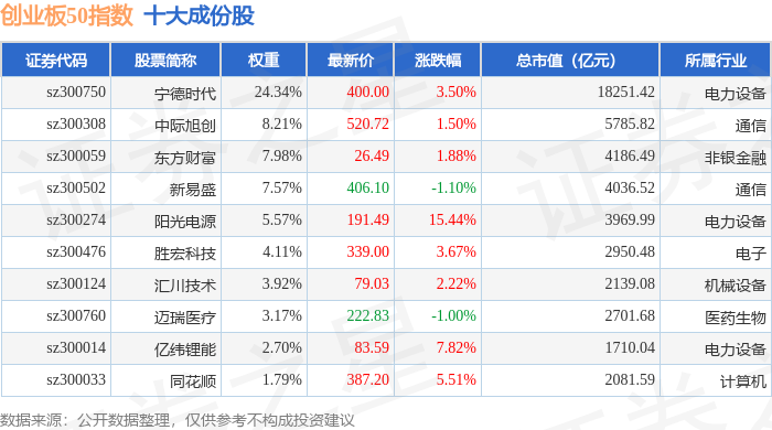 证券之星消息,10月29日,创业板50(399673)指数报收于3542.85点,涨3.34%,成交2396.6亿元,换手率3.64%。当日该指数成份股中,上涨的有38家,阳光电源以15.44%的涨幅领涨,下跌的有12家,长盈精密以2.55%的跌幅领跌。