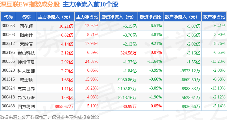 资金流向方面,深互联EW(399677)指数成份股当日主力资金净流入合计16.24亿元,游资资金净流出合计12.72亿元,散户资金净流出合计3.53亿元。成份股资金流向详情见下表: