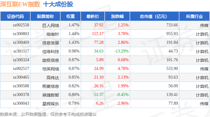 证券之星消息,10月29日,深互联EW(399677)指数报收于5773.3点,涨0.35%,成交897.74亿元,换手率3.83%。当日该指数成份股中,上涨的有72家,威士顿以19.99%的涨幅领涨,下跌的有90家,佳缘科技以13.29%的跌幅领跌。