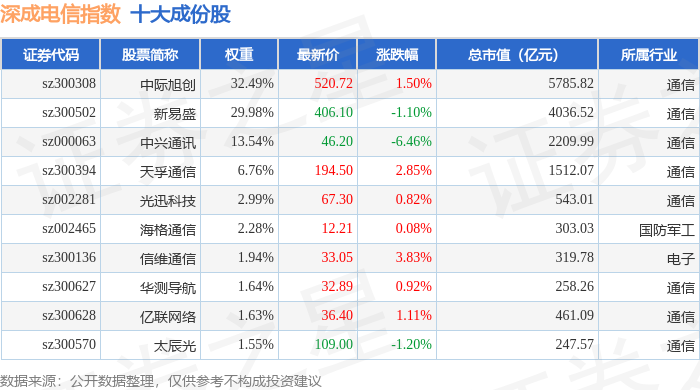 证券之星消息,10月29日,深成电信(399688)指数报收于6177.58点,跌0.25%,成交821.76亿元,换手率5.68%。当日该指数成份股中,上涨的有11家,普天科技以5.26%的涨幅领涨,下跌的有4家,中兴通讯以6.46%的跌幅领跌。