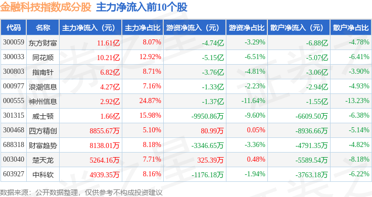 资金流向方面,金融科技(399699)指数成份股当日主力资金净流入合计27.63亿元,游资资金净流出合计15.34亿元,散户资金净流出合计12.29亿元。成份股资金流向详情见下表: