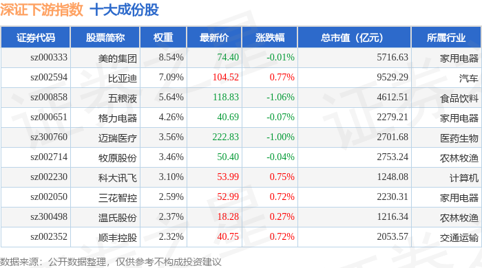 证券之星消息,10月29日,深证下游(399706)指数报收于5890.31点,涨0.73%,成交1073.41亿元,换手率1.63%。当日该指数成份股中,上涨的有65家,泰格医药以11.09%的涨幅领涨,下跌的有34家,百润股份以2.62%的跌幅领跌。