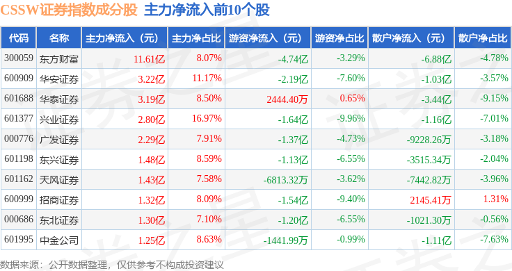 资金流向方面,CSSW证券(399707)指数成份股当日主力资金净流入合计37.89亿元,游资资金净流出合计22.25亿元,散户资金净流出合计15.63亿元。成份股资金流向详情见下表: