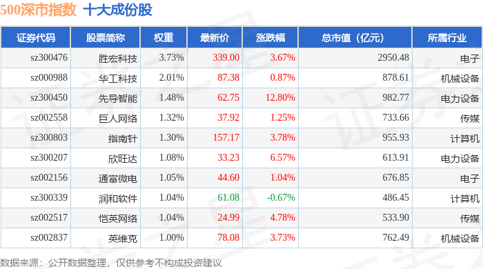 500深市(399802)指数十大成份股详情如下:
