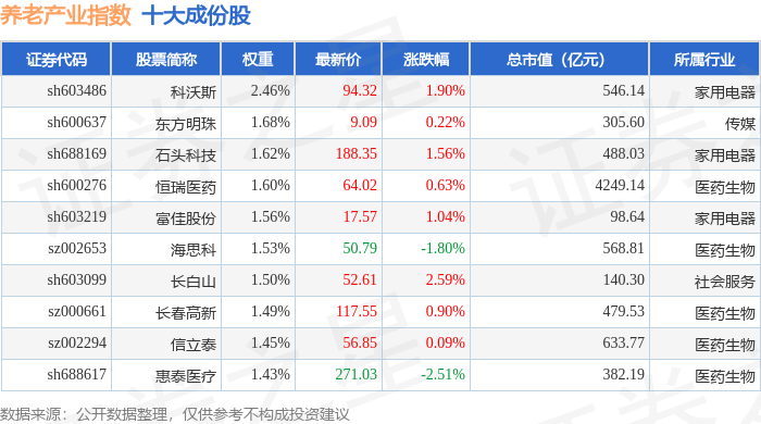 养老产业(399812)指数十大成份股详情如下: