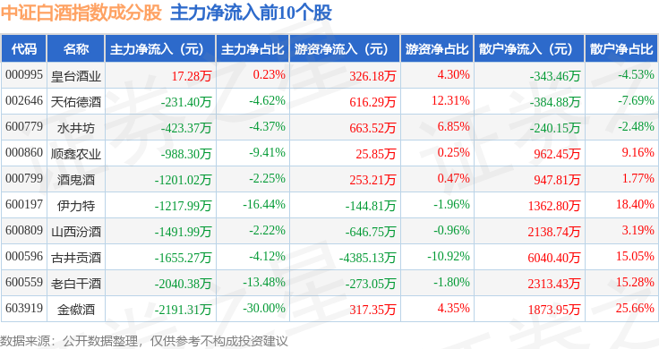 资金流向方面,中证白酒(399997)指数成份股当日主力资金净流出合计19.97亿元,游资资金净流入合计9.93亿元,散户资金净流入合计10.04亿元。成份股资金流向详情见下表: