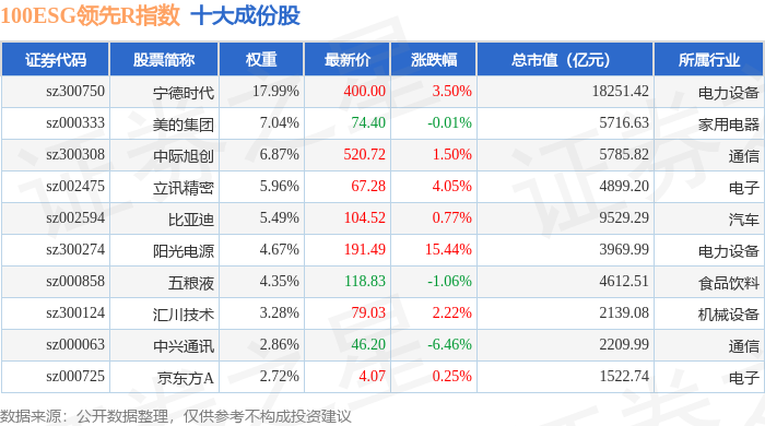 证券之星消息,10月29日,100ESG领先R(470030)指数报收于9618.78点,涨2.3%,成交1813.14亿元,换手率1.42%。当日该指数成份股中,上涨的有37家,阳光电源以15.44%的涨幅领涨,下跌的有13家,中兴通讯以6.46%的跌幅领跌。