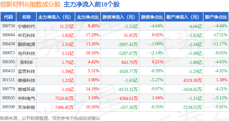 资金流向方面,创新材料R(470039)指数成份股当日主力资金净流入合计17.85亿元,游资资金净流出合计9.59亿元,散户资金净流出合计8.26亿元。成份股资金流向详情见下表: