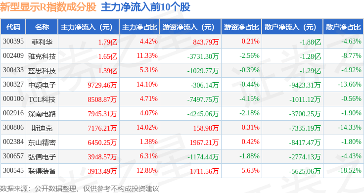 资金流向方面,新型显示R(470048)指数成份股当日主力资金净流出合计13.03亿元,游资资金净流出合计1.17亿元,散户资金净流入合计14.2亿元。成份股资金流向详情见下表: