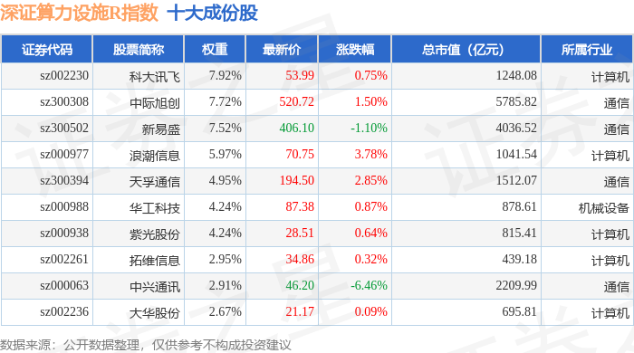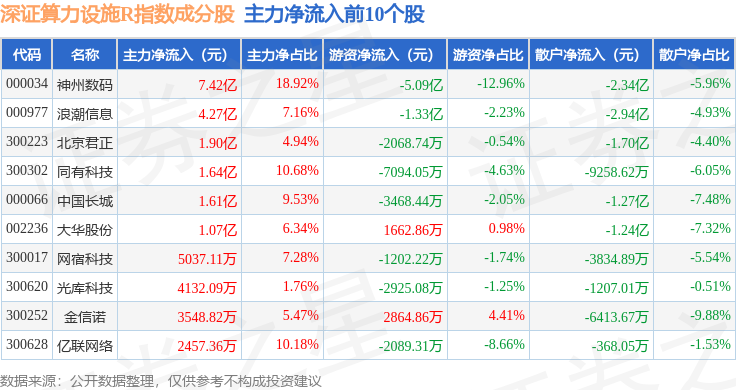 资金流向方面,深证算力设施R(470051)指数成份股当日主力资金净流出合计32.73亿元,游资资金净流入合计19.87亿元,散户资金净流入合计12.86亿元。成份股资金流向详情见下表: