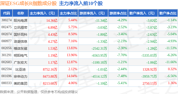 资金流向方面,深证ESG成长R(470060)指数成份股当日主力资金净流入合计16.11亿元,游资资金净流出合计10.14亿元,散户资金净流出合计5.97亿元。成份股资金流向详情见下表: