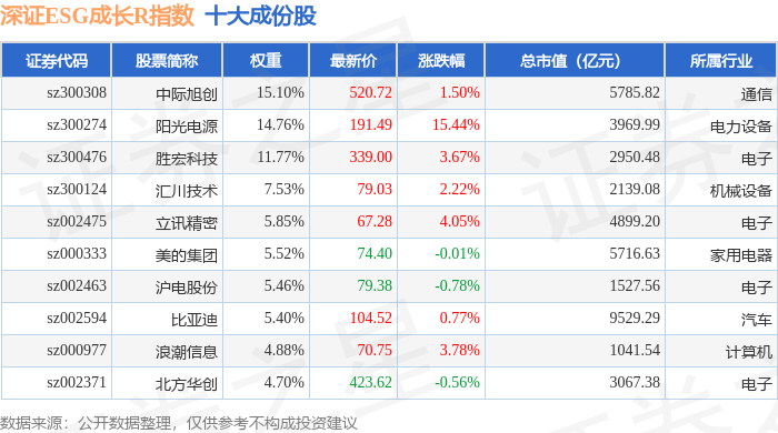 深证ESG成长R(470060)指数十大成份股详情如下: