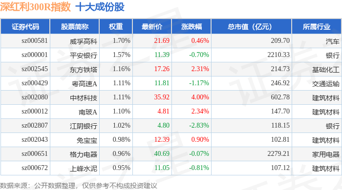 证券之星消息,10月29日,深红利300R(470062)指数报收于8208.27点,涨1.11%,成交2312.17亿元,换手率2.03%。当日该指数成份股中,上涨的有196家,三环集团以10.25%的涨幅领涨,下跌的有96家,中兴通讯以6.46%的跌幅领跌。