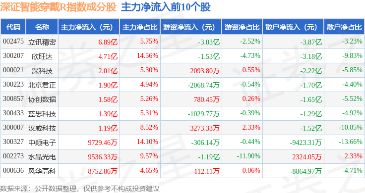 资金流向方面,深证智能穿戴R(470074)指数成份股当日主力资金净流入合计6.52亿元,游资资金净流出合计3.55亿元,散户资金净流出合计2.97亿元。成份股资金流向详情见下表: