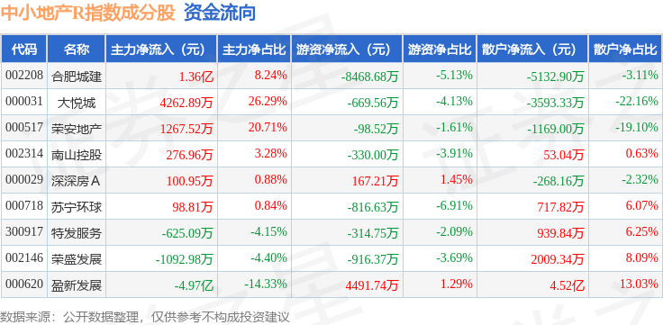 资金流向方面,中小地产R(471002)指数成份股当日主力资金净流出合计3.18亿元,游资资金净流出合计6955.56万元,散户资金净流入合计3.88亿元。成份股资金流向详情见下表: