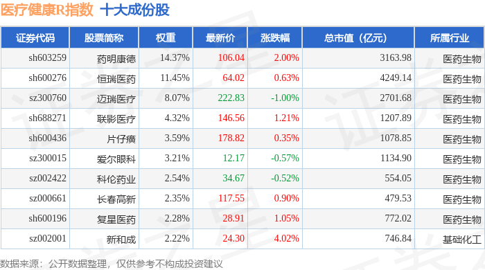 证券之星消息,10月29日,医疗健康R(480016)指数报收于7825.22点,涨0.72%,成交325.93亿元,换手率1.04%。当日该指数成份股中,上涨的有32家,泰格医药以11.09%的涨幅领涨,下跌的有17家,泽璟制药以12.97%的跌幅领跌。