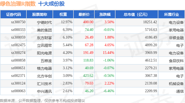 证券之星消息,10月29日,绿色治理R(480058)指数报收于1618.27点,涨1.79%,成交1745.68亿元,换手率1.62%。当日该指数成份股中,上涨的有70家,阳光电源以15.44%的涨幅领涨,下跌的有28家,中兴通讯以6.46%的跌幅领跌。