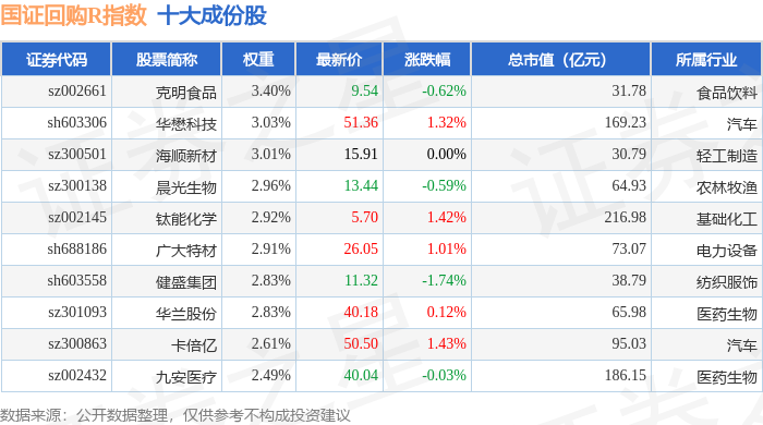证券之星消息,10月29日,国证回购R(480063)指数报收于3952.46点,涨0.41%,成交133.97亿元,换手率1.53%。当日该指数成份股中,上涨的有24家,方大炭素以10.04%的涨幅领涨,下跌的有24家,赞宇科技以2.66%的跌幅领跌。