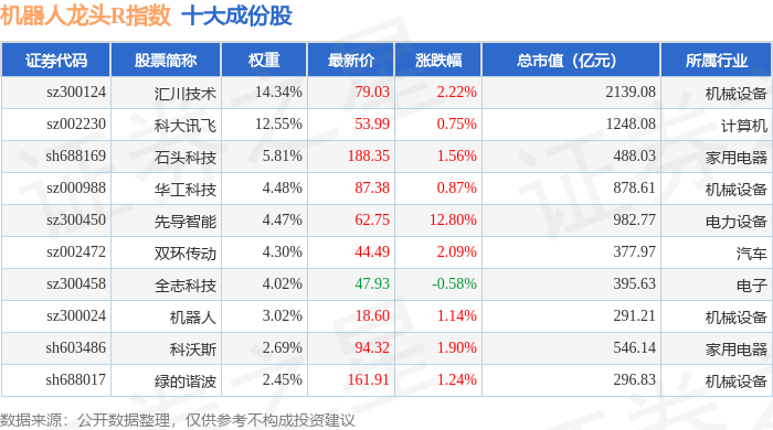 证券之星消息,10月29日,机器人龙头R(480071)指数报收于2818.72点,涨1.58%,成交500.9亿元,换手率3.34%。当日该指数成份股中,上涨的有37家,先导智能以12.8%的涨幅领涨,下跌的有13家,大豪科技以2.77%的跌幅领跌。