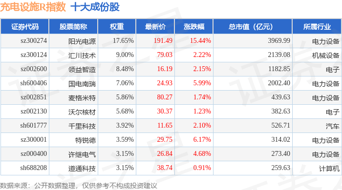 证券之星消息,10月29日,充电设施R(480077)指数报收于4374.76点,涨4.6%,成交564.13亿元,换手率3.24%。当日该指数成份股中,上涨的有32家,阳光电源以15.44%的涨幅领涨,下跌的有14家,双杰电气以7.9%的跌幅领跌。