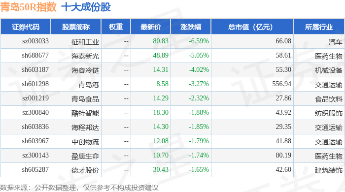 证券之星消息,10月29日,青岛50R(489011)指数报收于2708.44点,涨1.64%,成交112.36亿元,换手率1.85%。当日该指数成份股中,上涨的有26家,蔚蓝生物以10.0%的涨幅领涨,下跌的有15家,征和工业以6.59%的跌幅领跌。