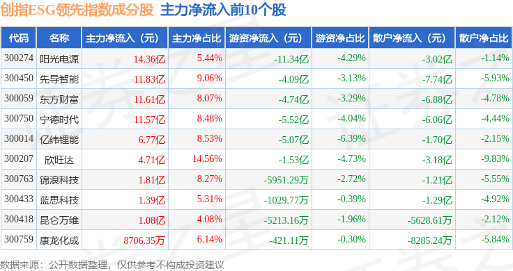 资金流向方面,创指ESG领先(970031)指数成份股当日主力资金净流入合计50.18亿元,游资资金净流出合计30.91亿元,散户资金净流出合计19.28亿元。成份股资金流向详情见下表: