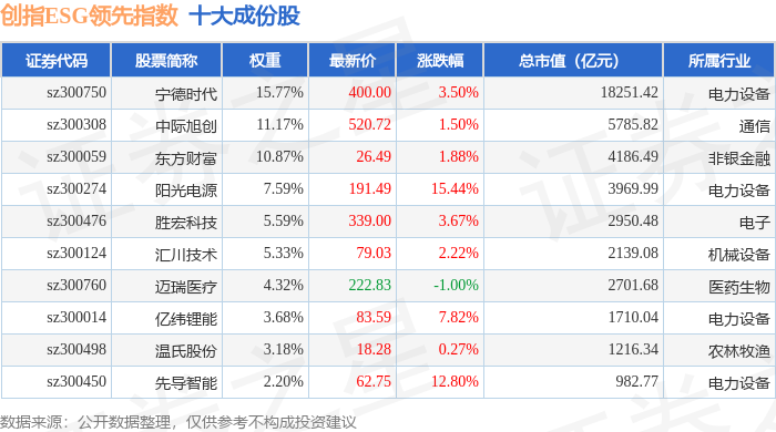 证券之星消息,10月29日,创指ESG领先(970031)指数报收于3676.19点,涨3.7%,成交1656.08亿元,换手率2.87%。当日该指数成份股中,上涨的有39家,阳光电源以15.44%的涨幅领涨,下跌的有11家,安克创新以2.16%的跌幅领跌。