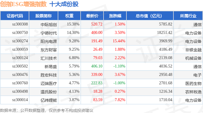 证券之星消息,10月29日,创指ESG增强(970034)指数报收于3133.75点,涨3.32%,成交1833.06亿元,换手率2.87%。当日该指数成份股中,上涨的有28家,阳光电源以15.44%的涨幅领涨,下跌的有12家,安克创新以2.16%的跌幅领跌。