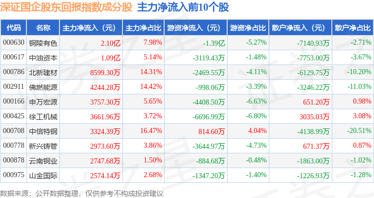 资金流向方面,深证国企股东回报(970064)指数成份股当日主力资金净流出合计7.73亿元,游资资金净流出合计2.48亿元,散户资金净流入合计10.21亿元。成份股资金流向详情见下表:
