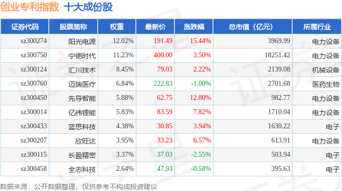 证券之星消息,10月29日,创业专利(970068)指数报收于6951.28点,涨4.35%,成交983.08亿元,换手率3.76%。当日该指数成份股中,上涨的有31家,阳光电源以15.44%的涨幅领涨,下跌的有19家,长盈精密以2.55%的跌幅领跌。