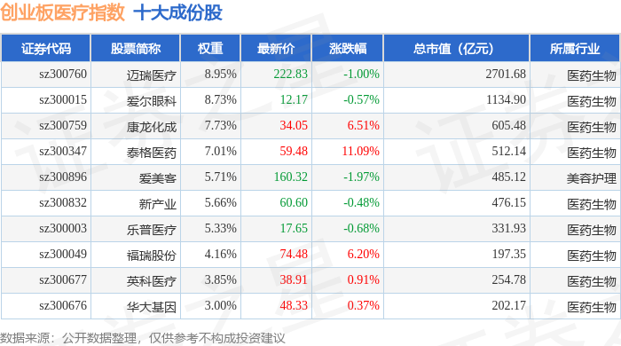 证券之星消息,10月29日,创业板医疗(970082)指数报收于3935.32点,涨1.3%,成交169.54亿元,换手率1.92%。当日该指数成份股中,上涨的有19家,诺思格以20.0%的涨幅领涨,下跌的有29家,开立医疗以11.39%的跌幅领跌。