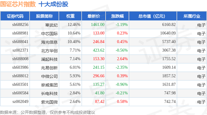 证券之星消息,10月29日,国证芯片(980017)指数报收于13820.1点,涨0.08%,成交975.73亿元,换手率3.08%。当日该指数成份股中,上涨的有20家,晶盛机电以3.71%的涨幅领涨,下跌的有10家,三安光电以2.37%的跌幅领跌。