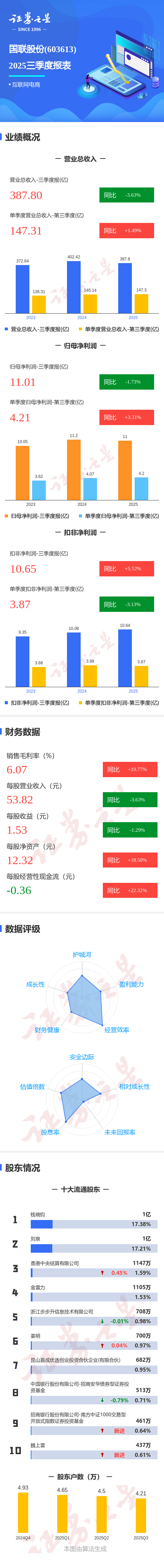 证券之星消息,国联股份2025年三季报显示,前三季度公司主营收入387.8亿元,同比下降3.63%;归母净利润11.01亿元,同比下降1.73%;扣非净利润10.65亿元,同比上升5.52%;其中2025年第三季度,公司单季度主营收入147.31亿元,同比上升1.49%;单季度归母净利润4.21亿元,同比上升3.31%;单季度扣非净利润3.87亿元,同比下降3.14%;负债率46.28%,投资收益-760.85万元,财务费用9198.47万元,毛利率6.07%。