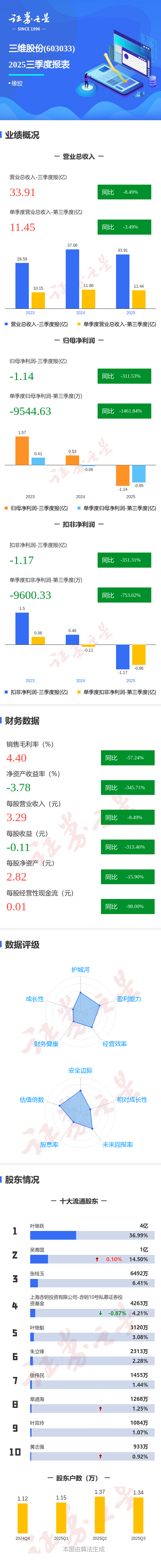 证券之星消息,三维股份2025年三季报显示,前三季度公司主营收入33.91亿元,同比下降8.5%;归母净利润-1.14亿元,同比下降311.53%;扣非净利润-1.17亿元,同比下降351.31%;其中2025年第三季度,公司单季度主营收入11.45亿元,同比下降3.5%;单季度归母净利润-9544.63万元,同比下降1461.84%;单季度扣非净利润-9600.33万元,同比下降753.03%;负债率71.36%,投资收益5860.85万元,财务费用1.21亿元,毛利率4.4%。