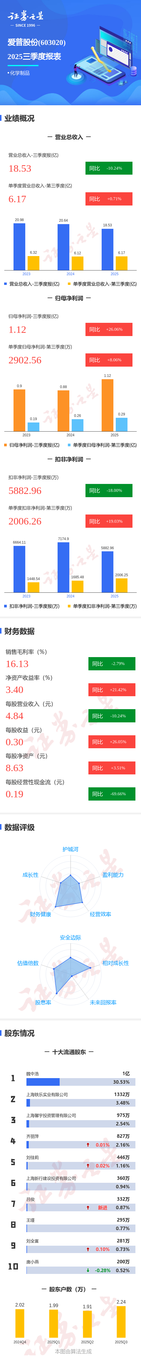证券之星消息,爱普股份2025年三季报显示,前三季度公司主营收入18.53亿元,同比下降10.24%;归母净利润1.12亿元,同比上升26.07%;扣非净利润5882.96万元,同比下降18.01%;其中2025年第三季度,公司单季度主营收入6.17亿元,同比上升0.71%;单季度归母净利润2902.56万元,同比上升8.07%;单季度扣非净利润2006.26万元,同比上升19.03%;负债率6.91%,投资收益2604.68万元,财务费用216.51万元,毛利率16.13%。