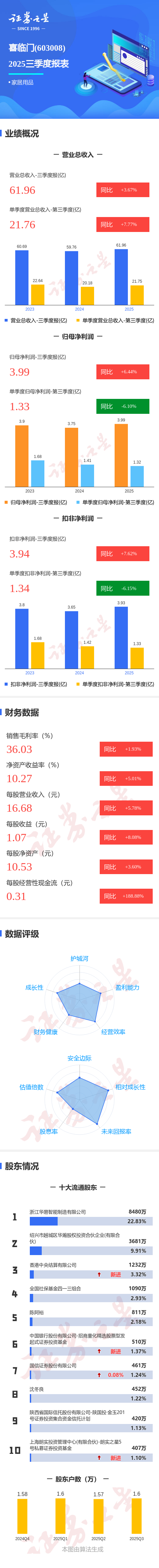 证券之星消息,喜临门2025年三季报显示,前三季度公司主营收入61.96亿元,同比上升3.68%;归母净利润3.99亿元,同比上升6.45%;扣非净利润3.94亿元,同比上升7.62%;其中2025年第三季度,公司单季度主营收入21.76亿元,同比上升7.78%;单季度归母净利润1.33亿元,同比下降6.1%;单季度扣非净利润1.34亿元,同比下降6.16%;负债率54.63%,投资收益296.45万元,财务费用3650.14万元,毛利率36.03%。