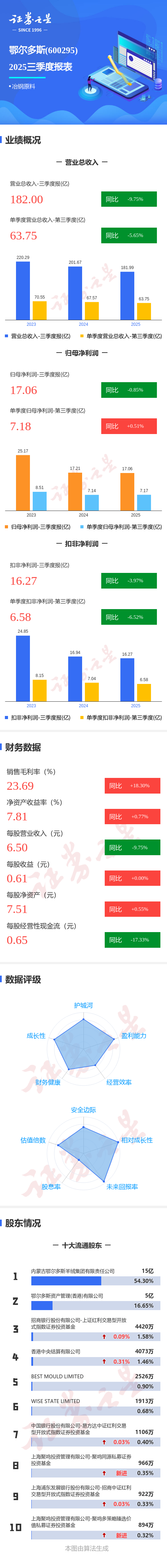 证券之星消息,鄂尔多斯2025年三季报显示,前三季度公司主营收入182.0亿元,同比下降9.76%;归母净利润17.06亿元,同比下降0.85%;扣非净利润16.27亿元,同比下降3.98%;其中2025年第三季度,公司单季度主营收入63.75亿元,同比下降5.66%;单季度归母净利润7.18亿元,同比上升0.51%;单季度扣非净利润6.58亿元,同比下降6.52%;负债率45.62%,投资收益7.29亿元,财务费用2411.09万元,毛利率23.69%。