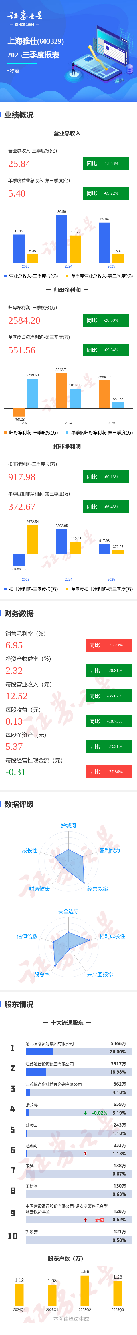 证券之星消息,上海雅仕2025年三季报显示,前三季度公司主营收入25.84亿元,同比下降15.54%;归母净利润2584.2万元,同比下降20.31%;扣非净利润917.98万元,同比下降60.14%;其中2025年第三季度,公司单季度主营收入5.4亿元,同比下降69.23%;单季度归母净利润551.56万元,同比下降69.64%;单季度扣非净利润372.67万元,同比下降66.44%;负债率61.53%,投资收益92.88万元,财务费用4433.21万元,毛利率6.95%。