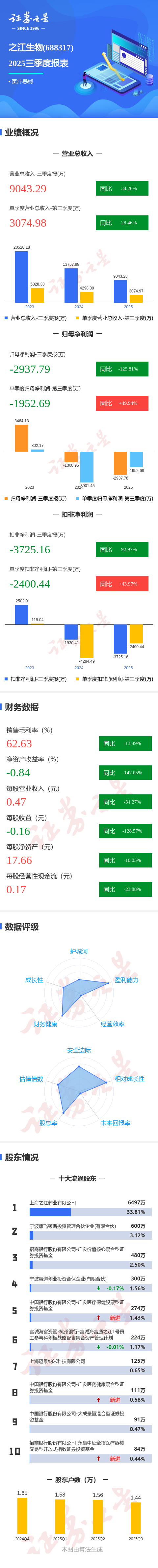 证券之星消息,之江生物2025年三季报显示,前三季度公司主营收入9043.29万元,同比下降34.27%;归母净利润-2937.79万元,同比下降125.82%;扣非净利润-3725.16万元,同比下降92.97%;其中2025年第三季度,公司单季度主营收入3074.98万元,同比下降28.46%;单季度归母净利润-1952.69万元,同比上升49.95%;单季度扣非净利润-2400.44万元,同比上升43.97%;负债率8.79%,投资收益280.49万元,财务费用-3134.01万元,毛利率62.63%。