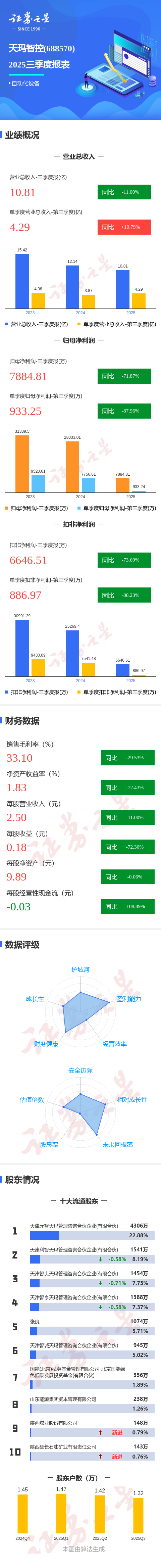 证券之星消息,天玛智控2025年三季报显示,前三季度公司主营收入10.81亿元,同比下降11.01%;归母净利润7884.81万元,同比下降71.87%;扣非净利润6646.51万元,同比下降73.7%;其中2025年第三季度,公司单季度主营收入4.29亿元,同比上升10.79%;单季度归母净利润933.25万元,同比下降87.97%;单季度扣非净利润886.97万元,同比下降88.24%;负债率25.78%,投资收益416.15万元,财务费用-2364.65万元,毛利率33.1%。