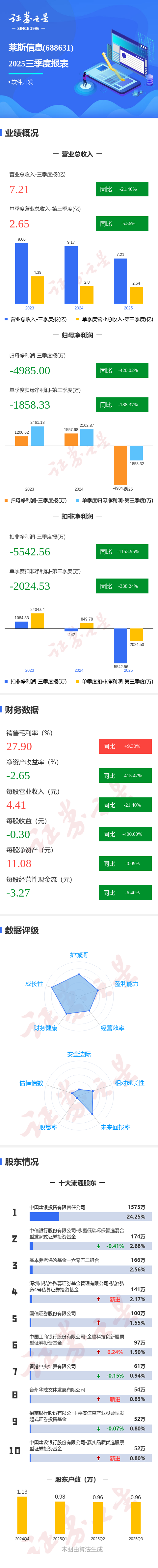 证券之星消息,莱斯信息2025年三季报显示,前三季度公司主营收入7.21亿元,同比下降21.41%;归母净利润-4985.0万元,同比下降420.03%;扣非净利润-5542.56万元,同比下降1153.95%;其中2025年第三季度,公司单季度主营收入2.65亿元,同比下降5.56%;单季度归母净利润-1858.33万元,同比下降188.37%;单季度扣非净利润-2024.53万元,同比下降338.24%;负债率44.2%,投资收益115.2万元,财务费用-345.04万元,毛利率27.9%。