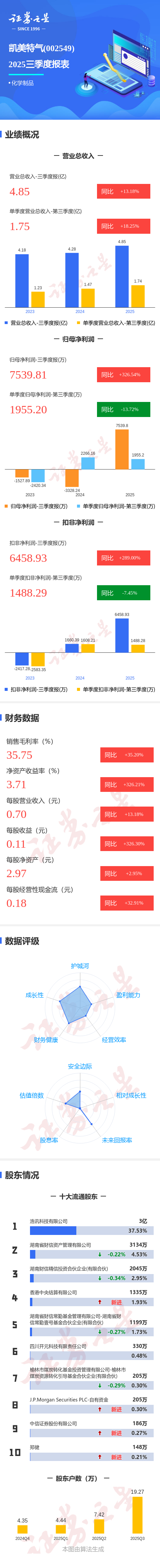 证券之星消息,凯美特气2025年三季报显示,前三季度公司主营收入4.85亿元,同比上升13.19%;归母净利润7539.81万元,同比上升326.54%;扣非净利润6458.93万元,同比上升289.0%;其中2025年第三季度,公司单季度主营收入1.75亿元,同比上升18.25%;单季度归母净利润1955.2万元,同比下降13.72%;单季度扣非净利润1488.29万元,同比下降7.46%;负债率28.17%,投资收益162.4万元,财务费用-83.8万元,毛利率35.75%。
