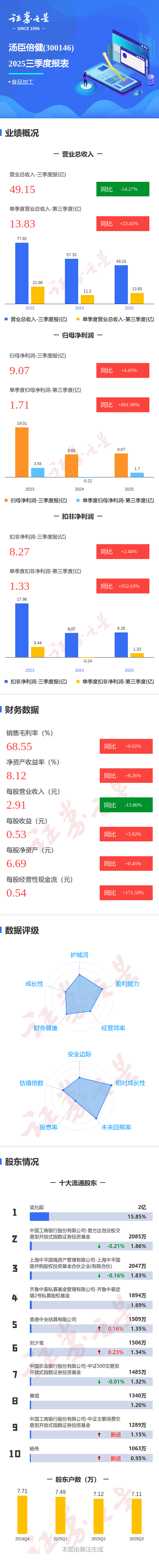 证券之星消息,汤臣倍健2025年三季报显示,前三季度公司主营收入49.15亿元,同比下降14.27%;归母净利润9.07亿元,同比上升4.45%;扣非净利润8.27亿元,同比上升2.44%;其中2025年第三季度,公司单季度主营收入13.83亿元,同比上升23.45%;单季度归母净利润1.71亿元,同比上升861.91%;单季度扣非净利润1.33亿元,同比上升652.64%;负债率18.6%,投资收益-966.68万元,财务费用-1411.32万元,毛利率68.55%。