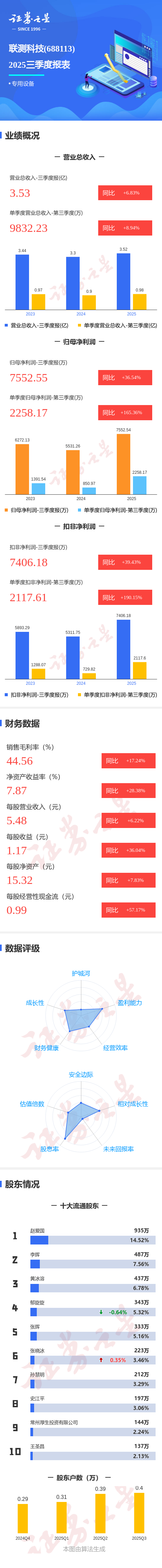 证券之星消息,联测科技2025年三季报显示,前三季度公司主营收入3.53亿元,同比上升6.84%;归母净利润7552.55万元,同比上升36.54%;扣非净利润7406.18万元,同比上升39.43%;其中2025年第三季度,公司单季度主营收入9832.23万元,同比上升8.95%;单季度归母净利润2258.17万元,同比上升165.36%;单季度扣非净利润2117.61万元,同比上升190.15%;负债率33.63%,投资收益467.89万元,财务费用-29.0万元,毛利率44.56%。