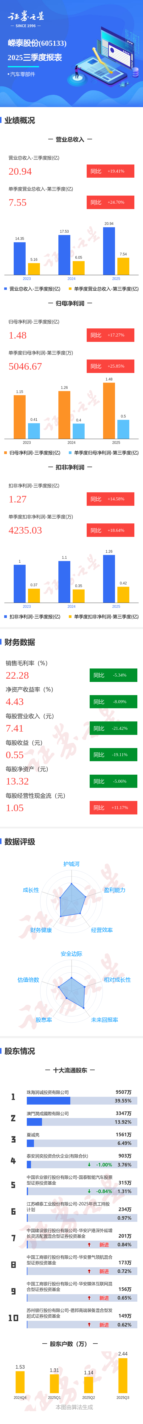 证券之星消息,嵘泰股份2025年三季报显示,前三季度公司主营收入20.94亿元,同比上升19.42%;归母净利润1.48亿元,同比上升17.28%;扣非净利润1.27亿元,同比上升14.59%;其中2025年第三季度,公司单季度主营收入7.55亿元,同比上升24.7%;单季度归母净利润5046.67万元,同比上升25.86%;单季度扣非净利润4235.03万元,同比上升18.65%;负债率41.02%,投资收益83.66万元,财务费用-131.8万元,毛利率22.28%。