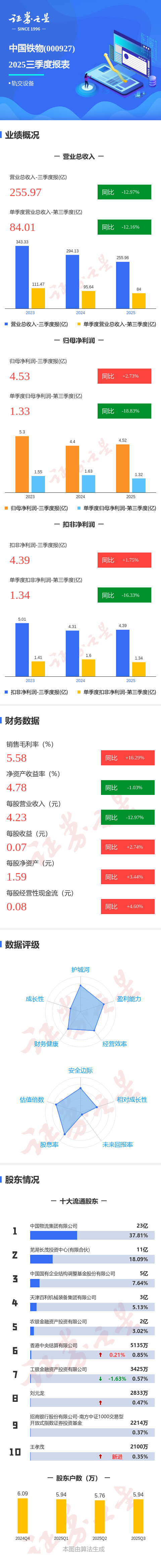 证券之星消息,中国铁物2025年三季报显示,前三季度公司主营收入255.97亿元,同比下降12.97%;归母净利润4.53亿元,同比上升2.74%;扣非净利润4.39亿元,同比上升1.76%;其中2025年第三季度,公司单季度主营收入84.01亿元,同比下降12.17%;单季度归母净利润1.33亿元,同比下降18.83%;单季度扣非净利润1.34亿元,同比下降16.33%;负债率47.63%,投资收益5240.51万元,财务费用560.94万元,毛利率5.58%。