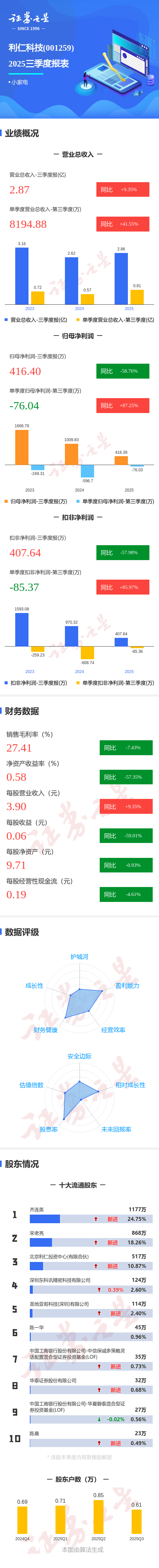 证券之星消息,利仁科技2025年三季报显示,前三季度公司主营收入2.87亿元,同比上升9.35%;归母净利润416.4万元,同比下降58.77%;扣非净利润407.64万元,同比下降57.99%;其中2025年第三季度,公司单季度主营收入8194.88万元,同比上升41.56%;单季度归母净利润-76.04万元,同比上升87.26%;单季度扣非净利润-85.37万元,同比上升85.98%;负债率14.31%,财务费用-243.77万元,毛利率27.41%。