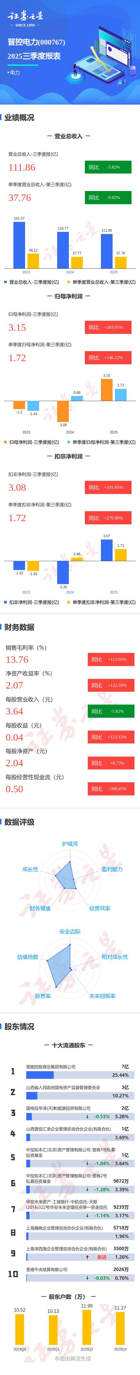 证券之星消息,晋控电力2025年三季报显示,前三季度公司主营收入111.86亿元,同比下降5.82%;归母净利润3.15亿元,同比上升203.02%;扣非净利润3.08亿元,同比上升191.86%;其中2025年第三季度,公司单季度主营收入37.76亿元,同比下降0.02%;单季度归母净利润1.72亿元,同比上升146.12%;单季度扣非净利润1.72亿元,同比上升270.9%;负债率82.08%,投资收益2.28亿元,财务费用9.94亿元,毛利率13.76%。