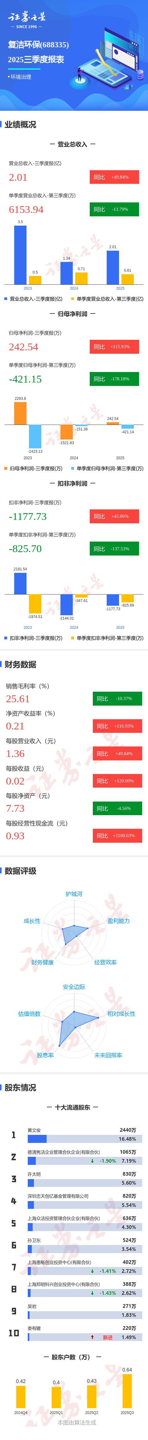 证券之星消息,复洁环保2025年三季报显示,前三季度公司主营收入2.01亿元,同比上升49.84%;归母净利润242.54万元,同比上升115.94%;扣非净利润-1177.73万元,同比上升45.07%;其中2025年第三季度,公司单季度主营收入6153.94万元,同比下降13.79%;单季度归母净利润-421.15万元,同比下降178.19%;单季度扣非净利润-825.7万元,同比下降137.53%;负债率21.32%,投资收益421.25万元,财务费用-27.76万元,毛利率25.61%。